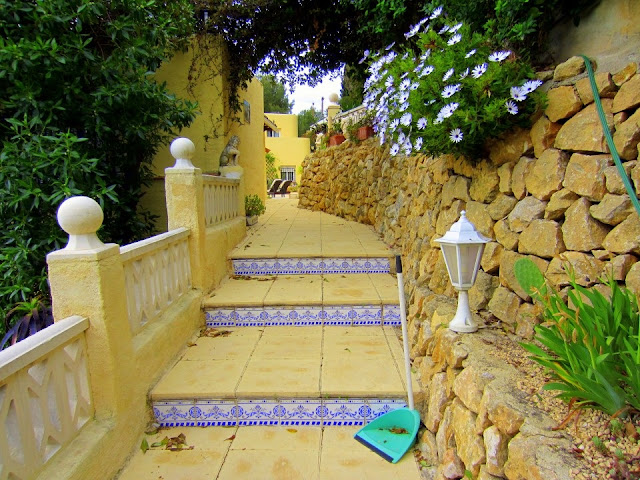 Det er foreløpig bare to måter å komme seg inn til den indre delen av eiendommen. På dette bildet ser vi en av dem. Trappene fortsetter ned til innkjørselen som ligger på forsiden av huset du ser til høyre. Når vi kjøpte eiendommen for mange år siden, var det bare dette huset som befant seg mitt i et ørkenlandskap av stein, tistler og sand. Ved en senere anledning kan jeg jo kanskje vise utviklingen om dere er interressert.